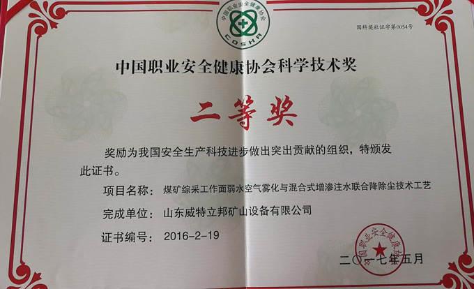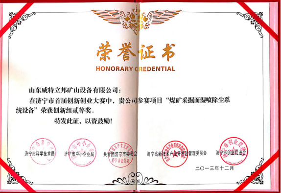 濟(jì)寧市首屆創(chuàng)新大賽“煤礦采掘面濕噴除塵系統(tǒng)設(shè)備”創(chuàng)新組二等獎(jiǎng)