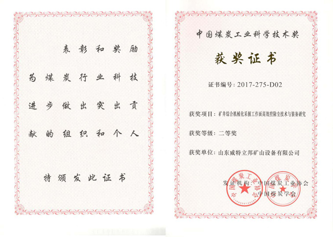 巖巷機(jī)械化掘進(jìn)粉塵污染控制技術(shù)及裝備科學(xué)技術(shù)進(jìn)步獎(jiǎng)